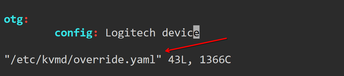 From there you’ll need some basic linux skills. Open the terminal, edit “/etc/kvmd/override.yaml” in your editor of choice, make it look like my screenshot (change the logitech string to match your source vid/pid/serial), then reboot.