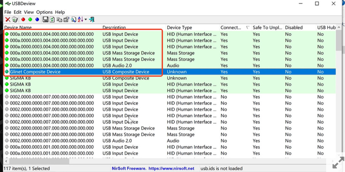 Also, can you explain to me where the Gli Composte device is showing? I am using beta 1.50 and can’t seem to find any reference to it in USBDeview?
