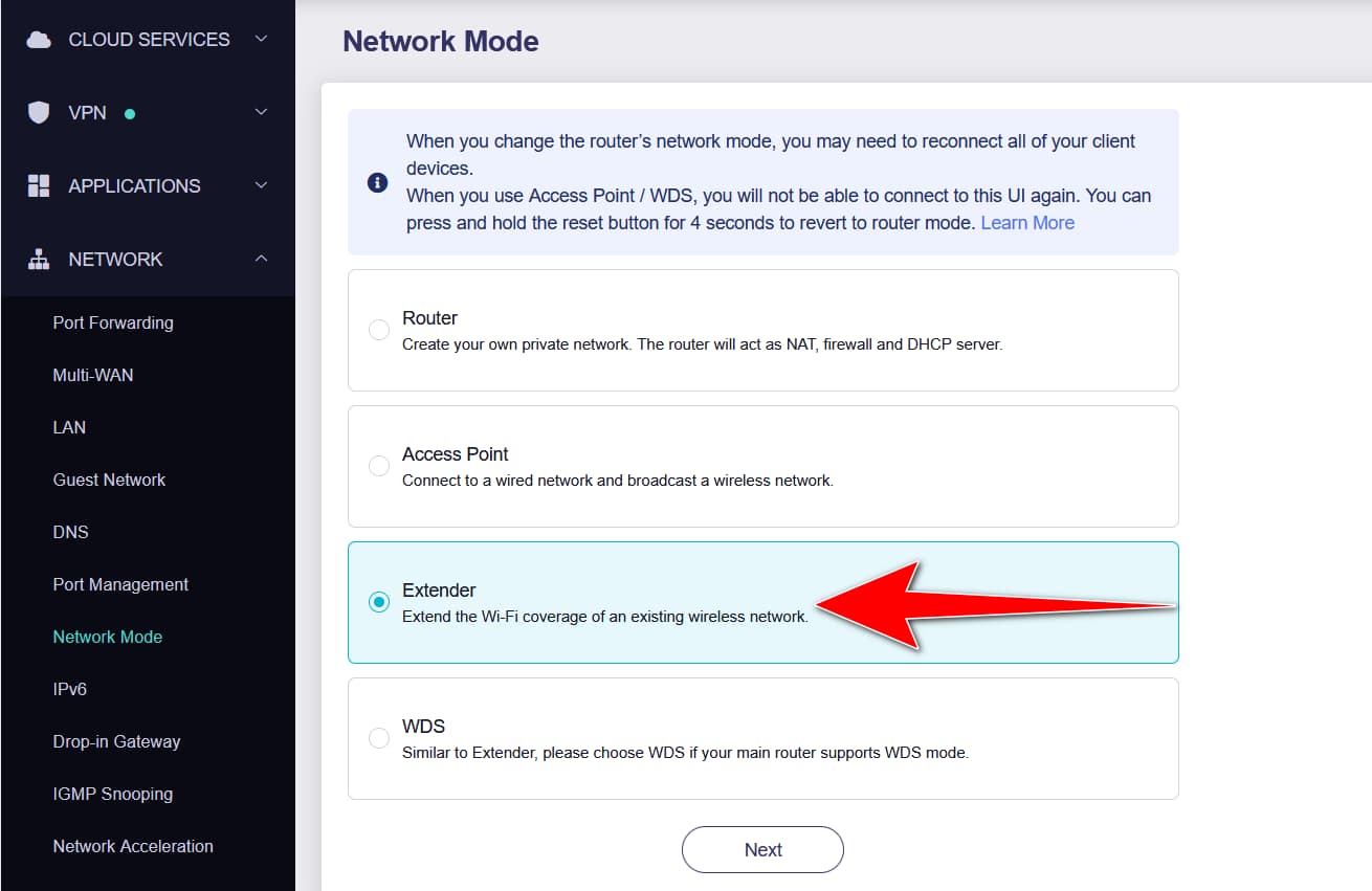 I can't change the Networkmode after I connected to Beryl as repeater. I somehow managed to change the VPN Settings and pointed out Slate to go through the tunnel. But now every device which connect to the SSID of Slate is beeing passed through VPN tunnel.