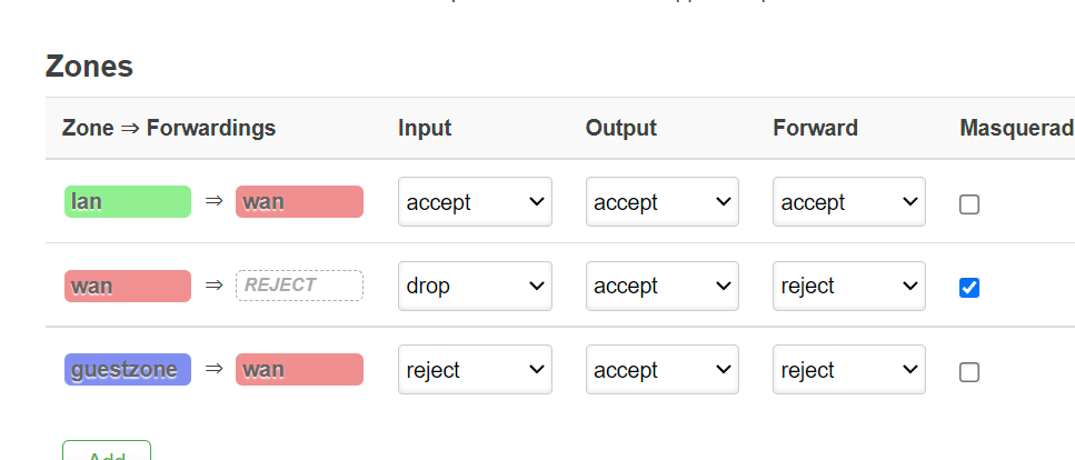 anyway - went back to ISP router and DMZ’ed main site… then LUCI setup to allow all traffic is as following: