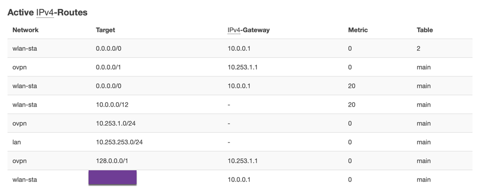 Second, as this is not routed via the VPN with the global “accept” I’ve checked the routes. It creates a direct route to my VPN server for the “wlan-sta” interface, using the uplink gateway of the network where the 750S is attached to: