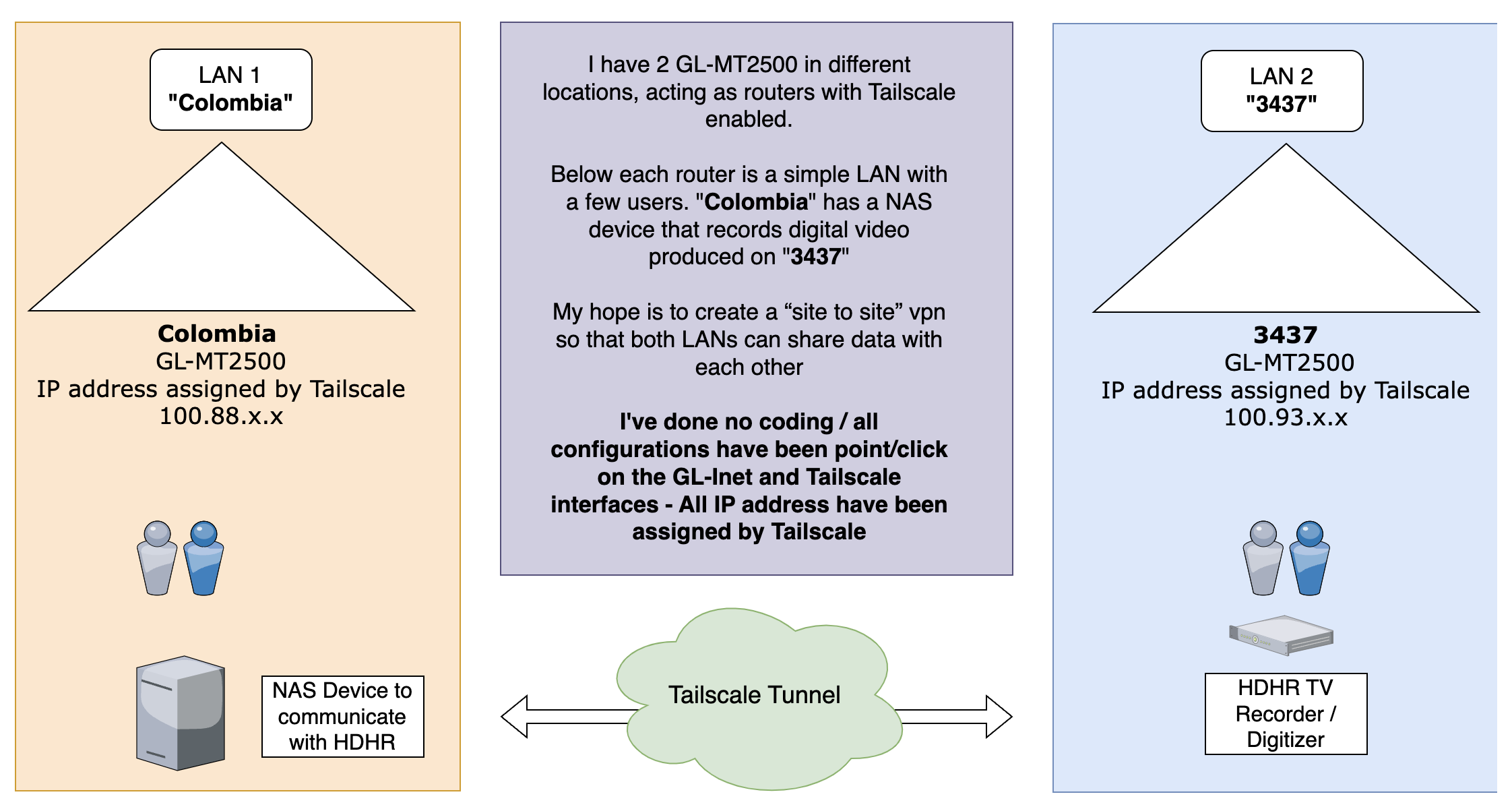I have 2 GL-MT2500 acting as routers with Tailscale enabled. My hope is to create a “site to site” vpn so that I can access NAS devices on both networks.
