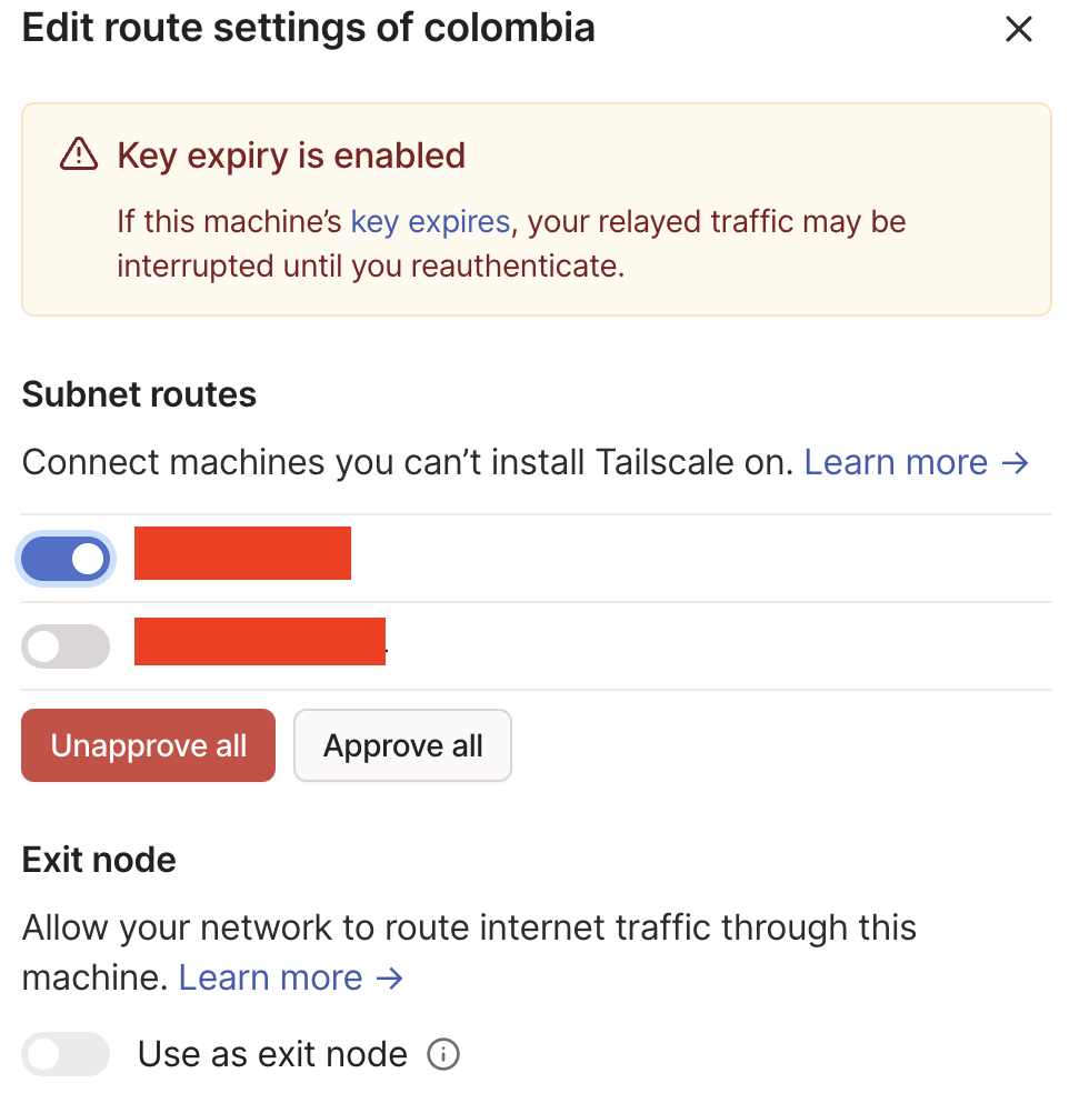 I remedy the situation by rebooting the 3437 network’s router, and turning off Tailscale on the “Colombia” network…