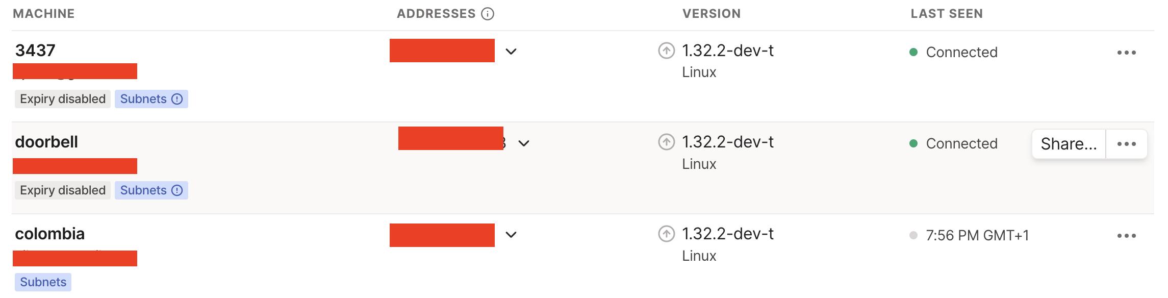 I hope this helps… it’s simple really - - sorry for not sending you any real IP Addresses, but I’ve done no modifications to the “point and click” settings that Tailscale provides… so they IP addresses are arbitrary… I’d be happy to change them as needed, per your advice…
