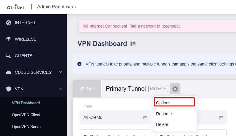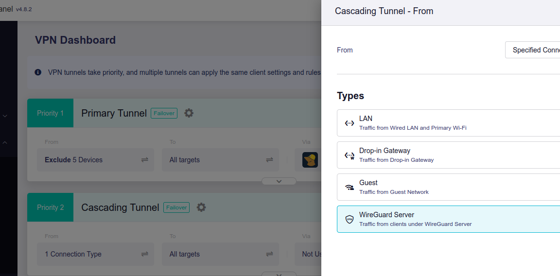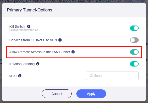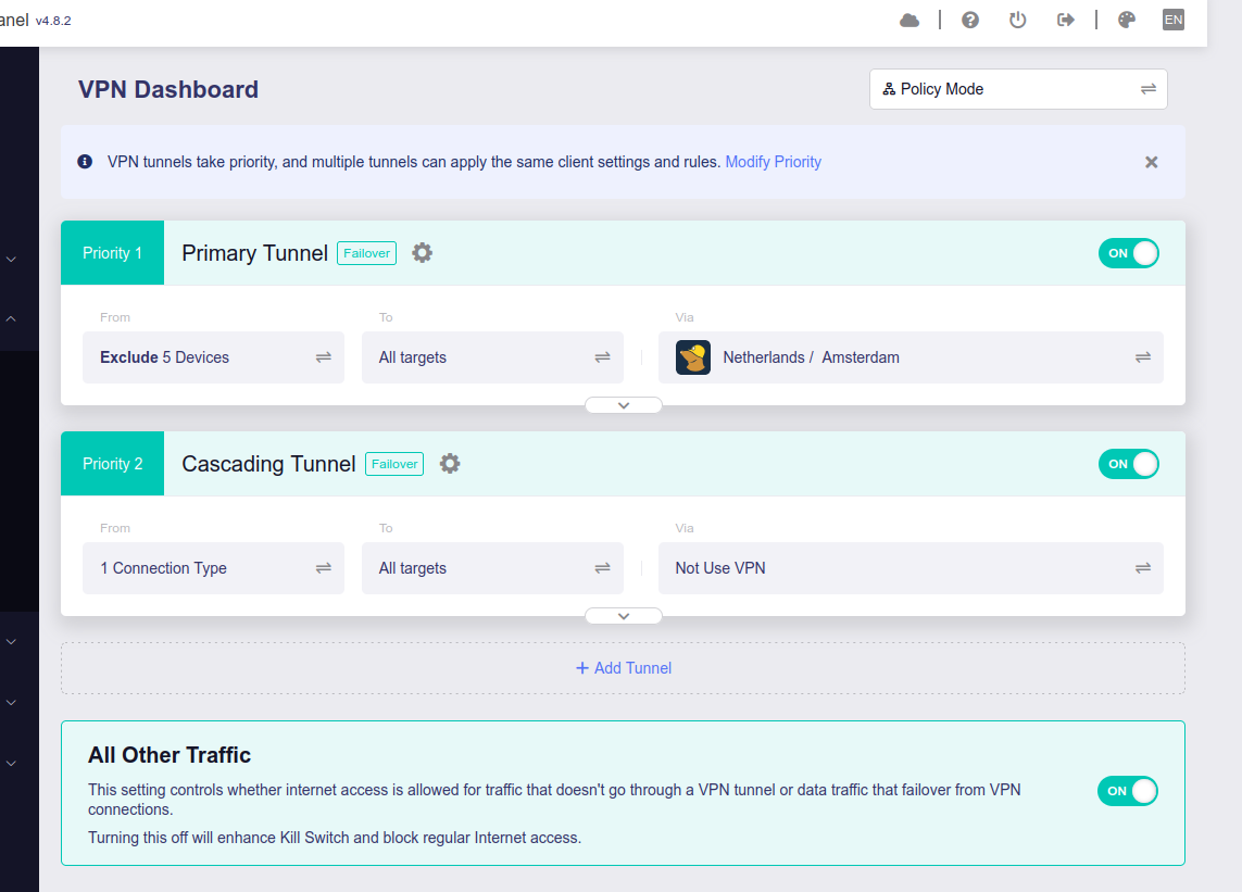 The primary tunnel sends or excludes traffic for some LAN clients.