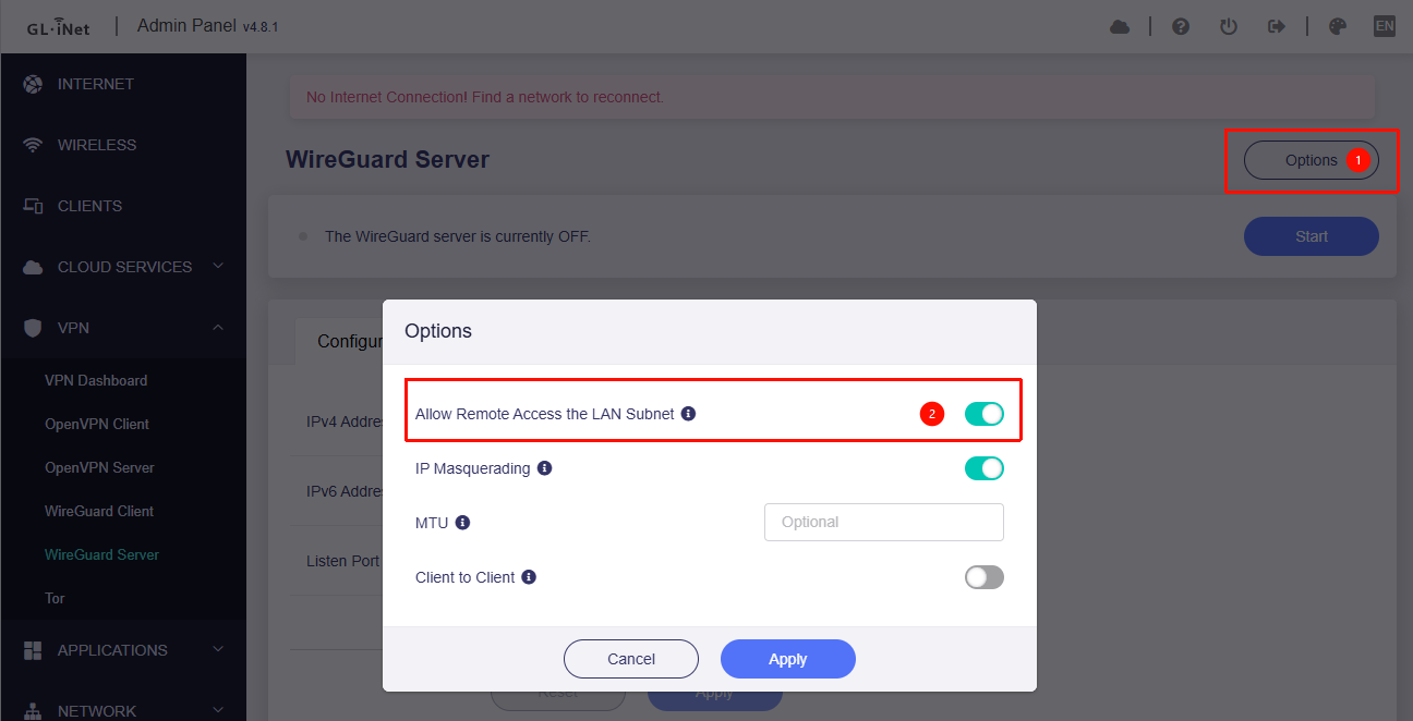 Enable the "Allow Remote Access to the LAN Subnet" so the LAN devices from WireGuard Server side could access the LAN devices on WireGuard Client side.