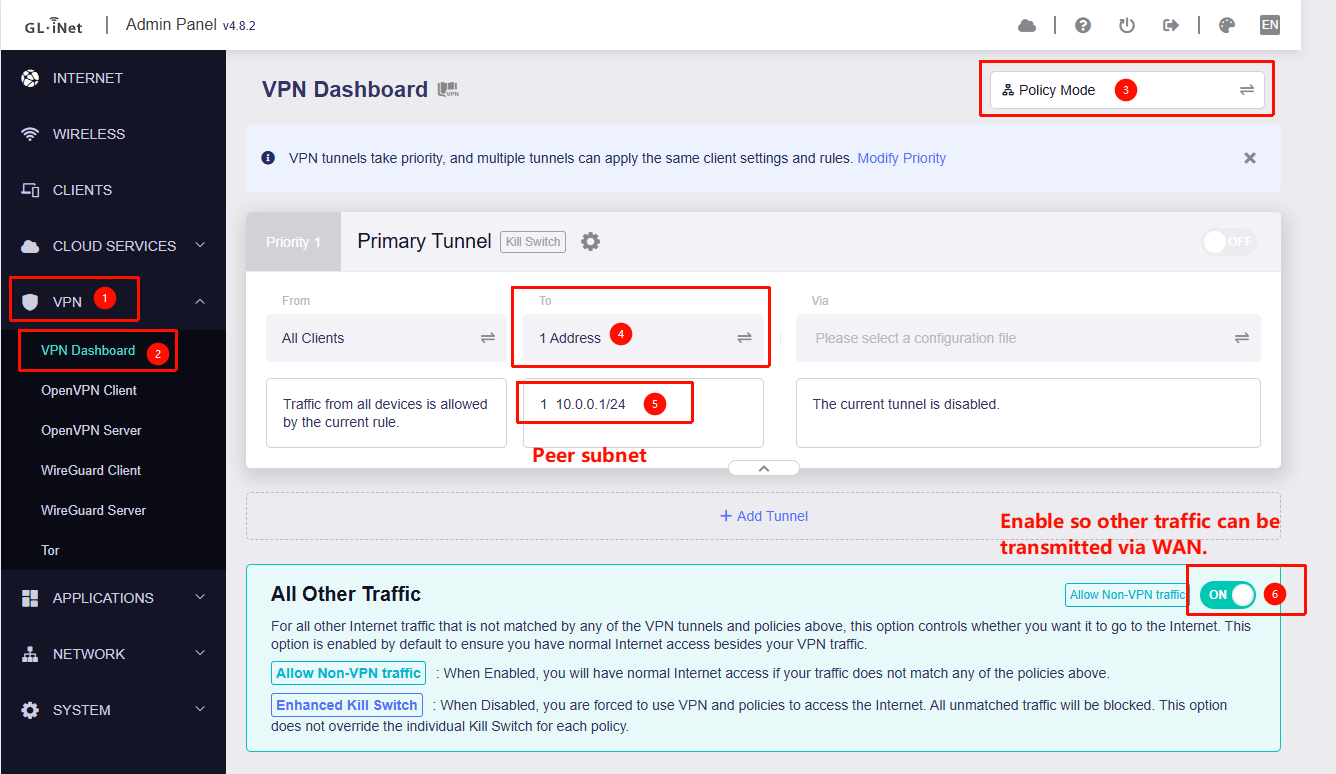 Go to Admin Panel → VPN → VPN Dashboard, switch to Policy Mode, and configure it so that only traffic destined for the remote subnet goes through the VPN.