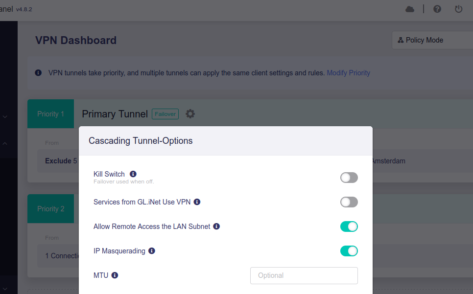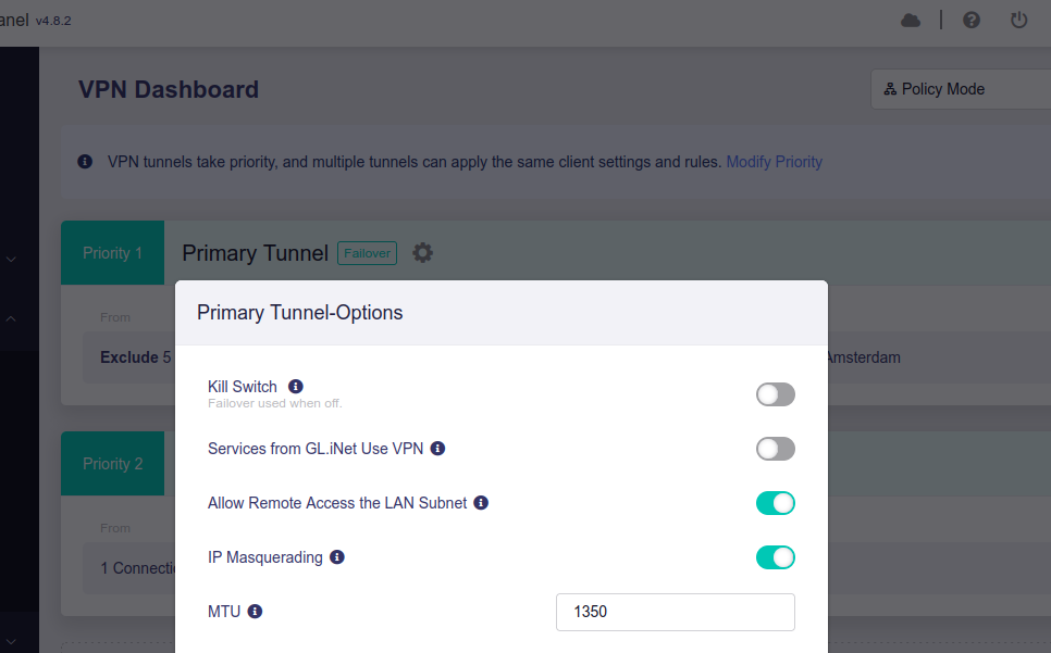 The only problem is that on the gl ax1800 I need to set proxy mode auto detect according to the gl-inet manual, but then the internet in this network does not work any more. If I switch to manual it works again without adding any route. The internet is provided by a G4 router in ip passthrough.