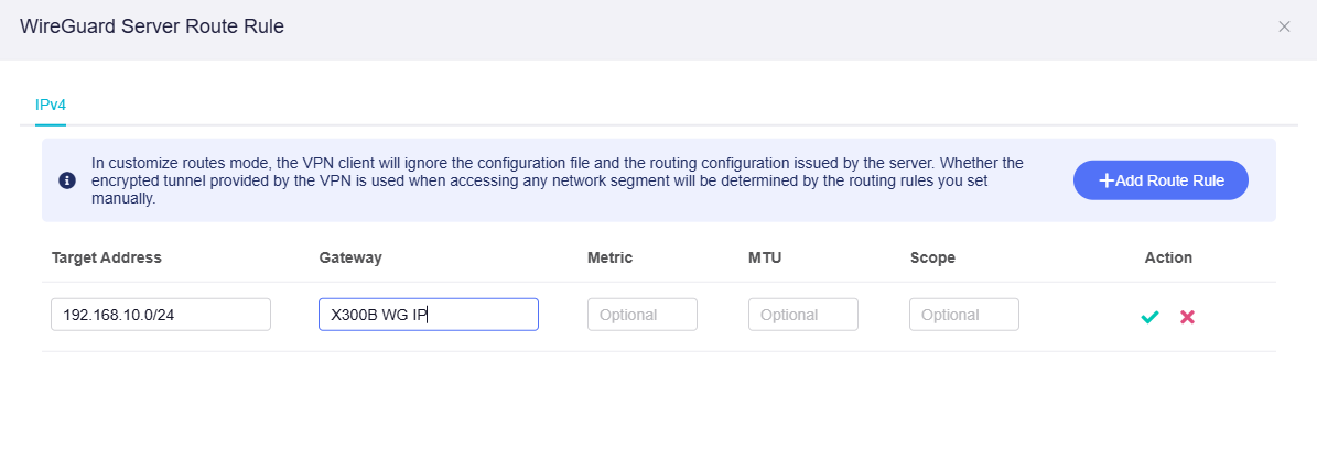 On MT2500, manually create a new route, Target Address is the X300B LAN subnet, like 192.168.10.0/24; Gateway is the X300B WG tunnel interface IP, like 10.0.0.2: