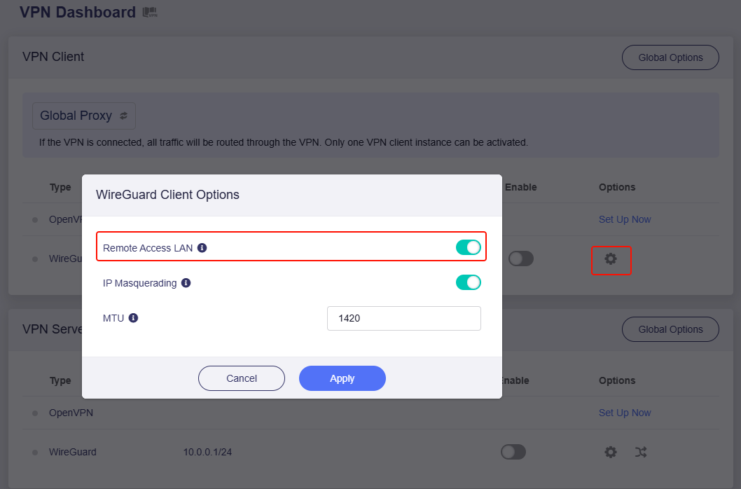 You can first configure the VPN server on the X300B, WireGuard is recommended, export the VPN profile, enable "Allow Remote Access the LAN Subnet", and connect the LAN clients such as NAS to the LAN port.