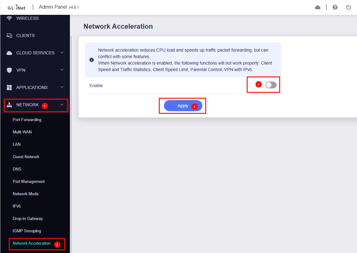 Hello, I have two routers, Flint 3 and Flint 2, and both have an issue with slow performance in qBittorrent. Download and upload speeds stay around 500 Mbps, while my ISP provides 1 Gbps. If I switch from hardware acceleration to software mode, the speed in qBittorrent reaches the full tariff, but then all other devices on the network completely lose internet access. I tried checking with "top" via SSH, and there is no critical load on the router. I also tried fully disabling acceleration, but that didn’t help either: qBittorrent works at full speed, yet all other devices end up without internet.
