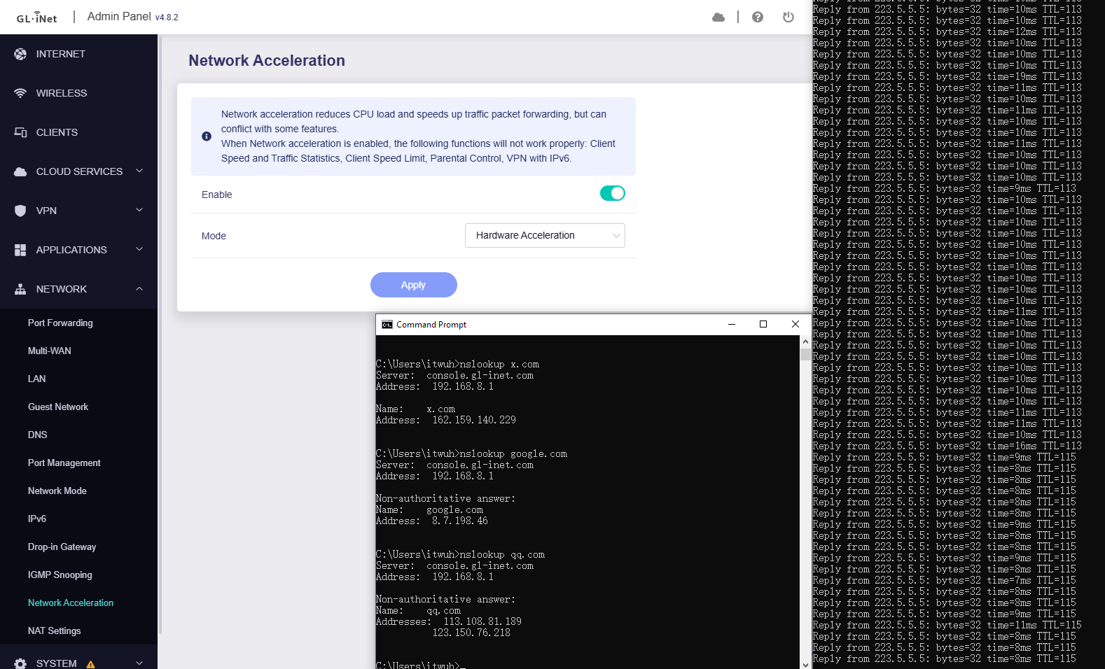 When router has problems, execute the following commands on the client pc and router SSH terminal to check: