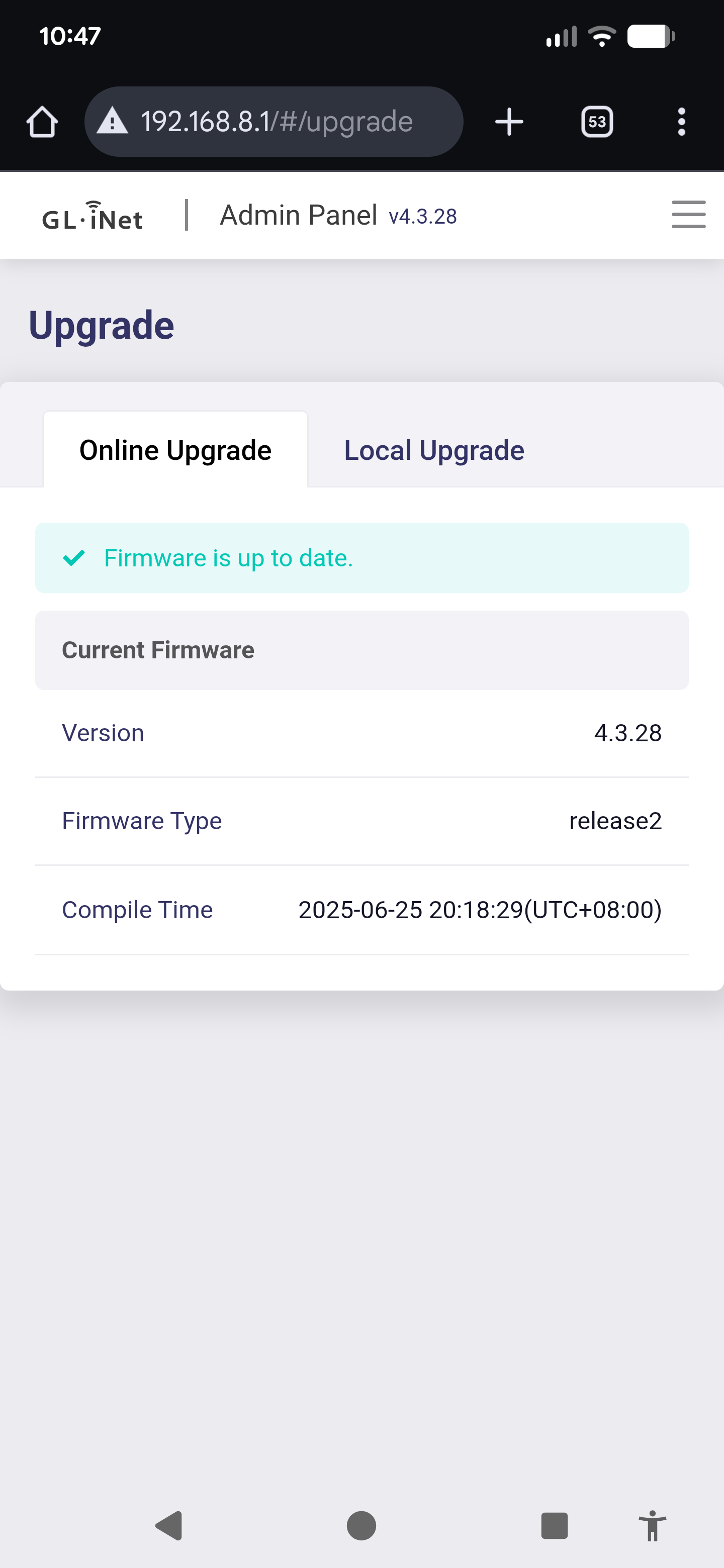 Firmware version is 4.3.28 - this is higher than the latest stable version on the firmware page, GL.iNet download center | GL-SFT1200 Opal but that’s what it came with out of the box.