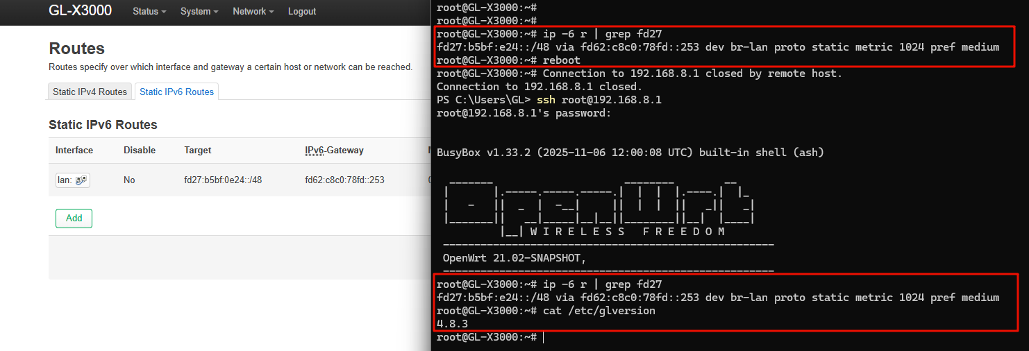 I have three networks behind my OPNsense firewall (set to route mode) and I’ve defined associated static IPv4 and IPv6 routes via LuCI. This works as intended until I reboot the Spitz. When it comes up, IPv4 traffic to and through the unit works, but IPv6 traffic to and through the unit fails.