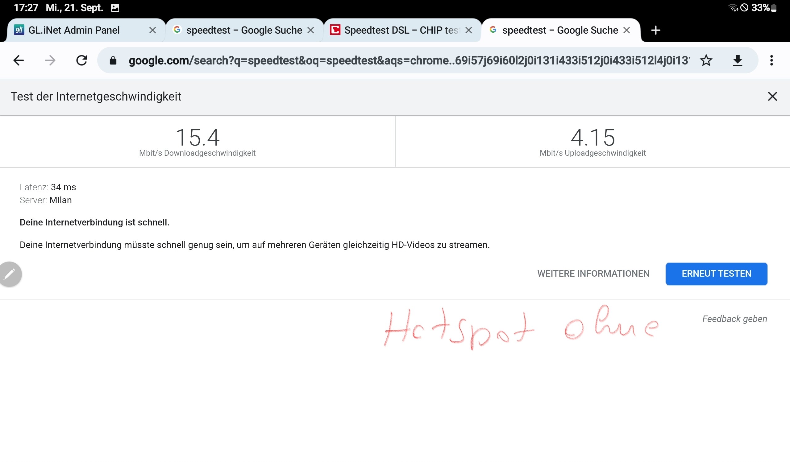 I have a Spitz X750 (mobile home) with Wireguard Client and on my Fritzbox (at home) a Creta as Wireguard Server! Now I’ve noticed that when I go online via the Spitz, the connection is extremely slow (screenshot)! On the other hand, if I go directly to the hotspot of the camping site and activate Wireguard on the end device (Samsung Tablet Android), it runs much faster (screenshot)! What’s wrong with the router???
