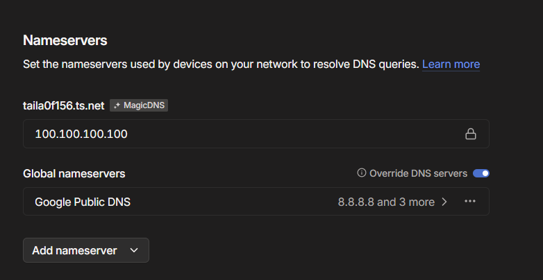 By default, only domain names ending with ts.net are routed to Tailscale’s DNS.