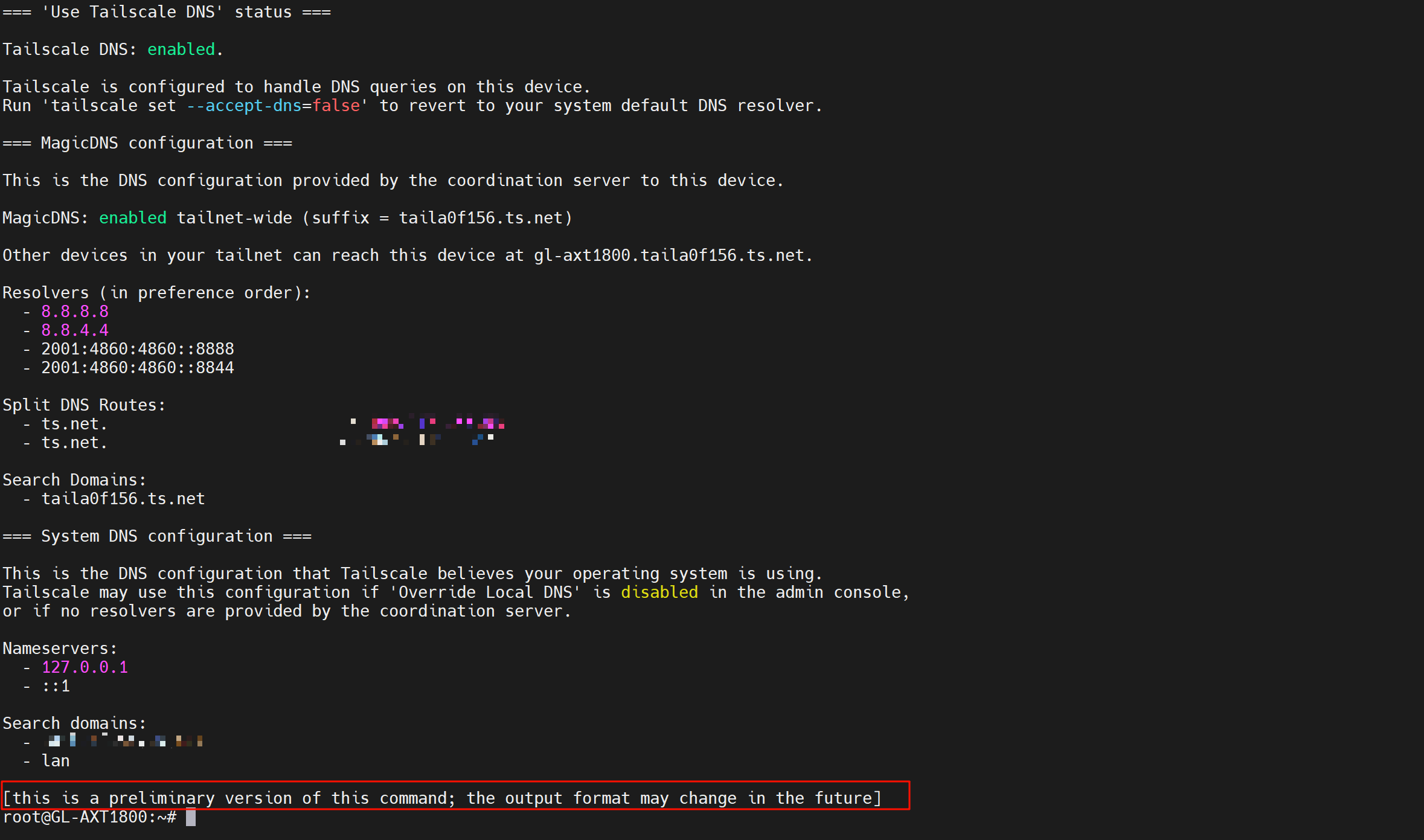 On my GL-AXT1800 (Version: 4.8.2. Firmware Type: release5) I have configured Tailscale to use an exit node on my LAN when working remotely. To allow both intranet and internet traffic I had to check the Masquerading for the tailscale0 zone using LUCI. Using an SSH connection I manually entered tailscale set --accept-dns=true, it was false, however the DNS provided by the tethered device is still used, the only way I could use the DNS on the LAN was to use the Manual setting on the GUI DNS page and enter its IP address explicitly.