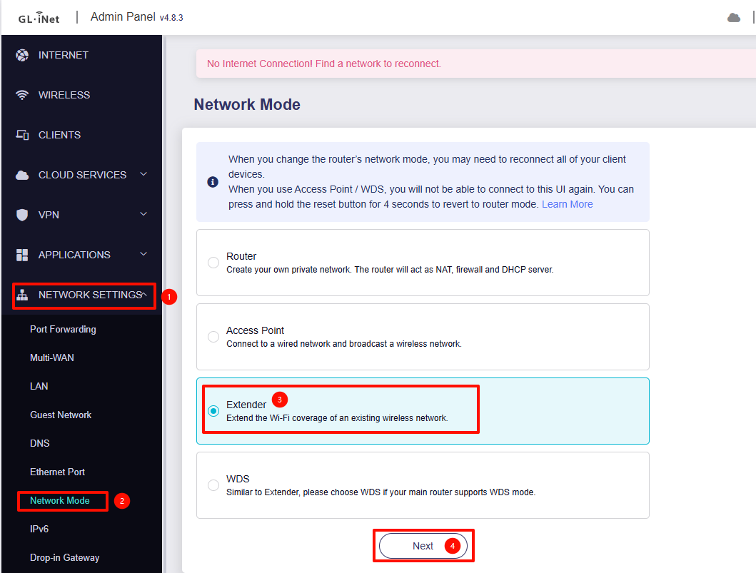 I’m new to network hardware stuff, but I am trying to set up my Beryl AX (GL-MT3000) as a network extender. My main router is a Flint 3 (GL-BE9300). Unfortunately, the Flint 3 is on one side of the house, and we have a nearly-dead spot on the other side of the house. I am hoping to use the Beryl AX as a network extender in the nearly-dead spot.