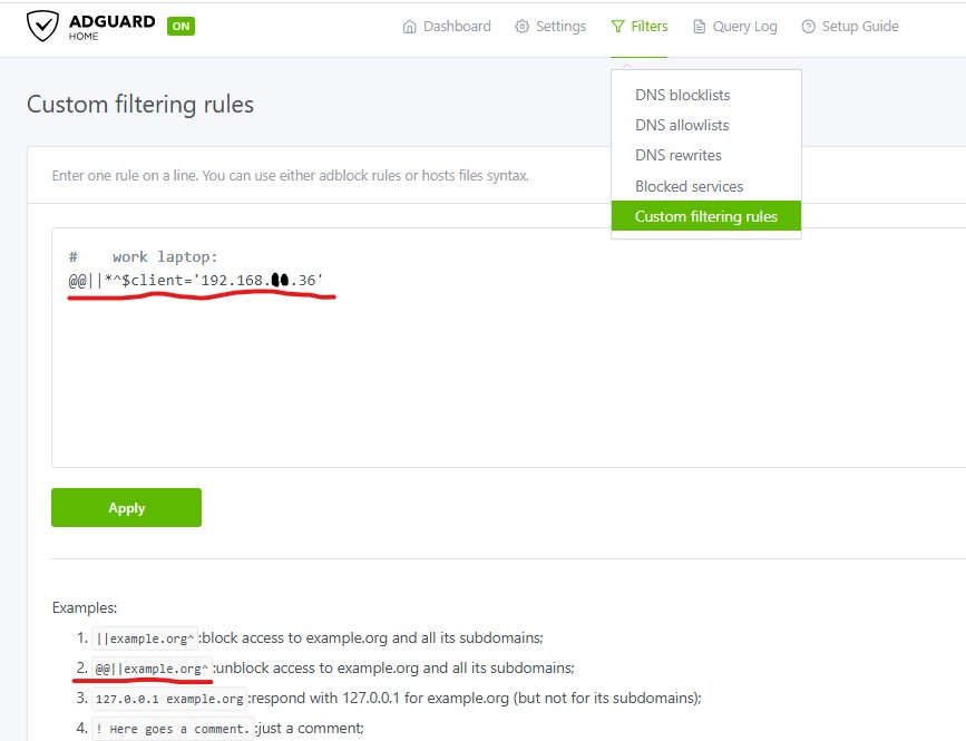 I'm all out of ideas for your use case. I use the following Custom Filter in Adguard for my work laptop. This rule prevents Adguard from blocking requests from this laptop. I setup a static IP in the laptop so it that never changes.