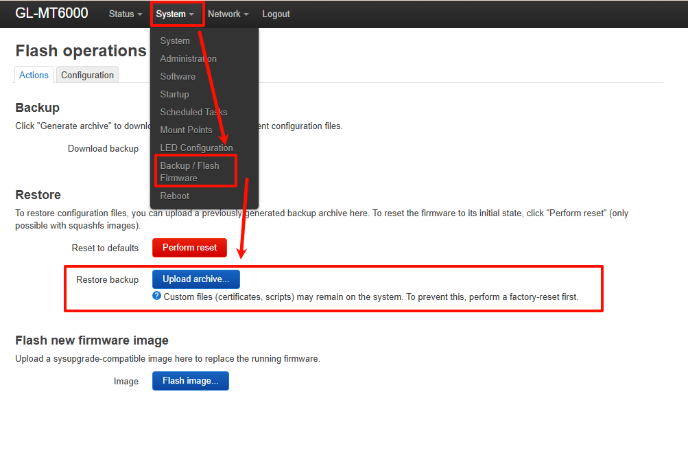 I purchased several GL.iNet GL-MT3000 routers. I backed up one that I configured using the luci tool in advanced settings. What is the procedure to restore or clone the other routers using the backup file.
