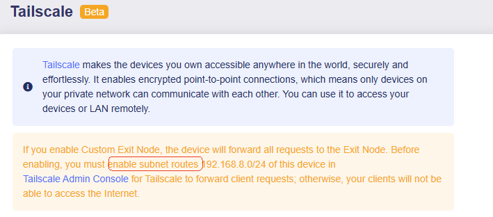 To reach the internet via the exit node, enabling certain Subnet routes in the Tailscale Console is necessary.