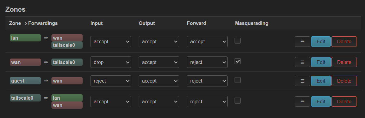 These are my default settings in LuCI - should I modify “lan > wan” and “guest > wan” to drop/drop/drop?
