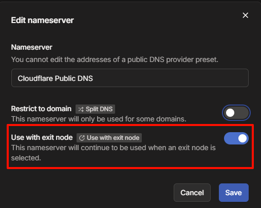 Please also make sure DNS is configured in the Tailscale Admin Console and that it is enabled for the Exit Node.