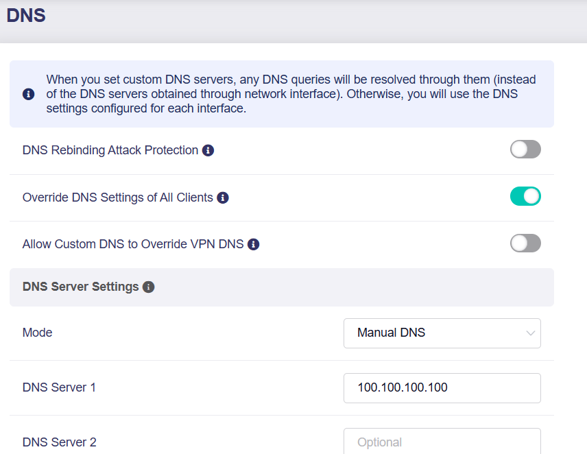 I have tailscale set up on my router with an overseas exit node. I have set Cloudflare (1.1.1.1) as the DNS and enabled overriding client DNS settings.
