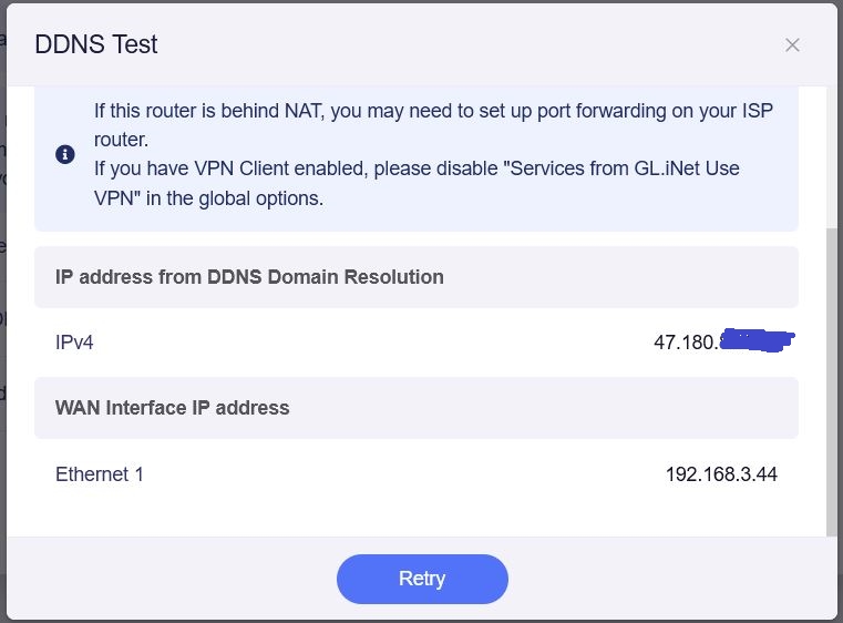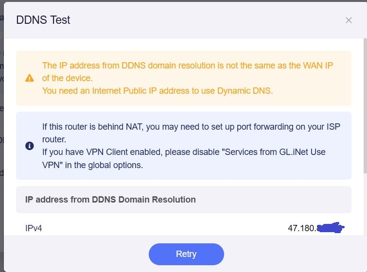 Hello, I purchased the AX1800 travel router and the MT6000 router I wish to use them with the wire-guard VPN service with the MT6000 as the server and the AX1800 as the client, my ISP is Frontier 2gig with the TP-Link ax3000 as the ISP router (wired only) configuration. I setup the AX3000 to port forward to my MT6000 via the internet address and port 51280, the problem is the AX1800 is not seen by the MT6000, when I attempt to tunnel the devices, I'm using a separate network via a stand alone hot spot for the AX1800, the problem begins when I access the admin panel on the MT6000 and enter applications and run DDNS-TEST the system reports, The IP address from DDNS domain resolution is not the same as the WAN IP of the device. You need an Internet Public IP address to use Dynamic DNS. If this router is behind NAT, you may need to set up port forwarding on your ISP router. which I believe I have already done.The VPN is blue lit indicating the VPN server is functioning, but when I attempt to connect the AX1800 via VPN tunnel the lights on the client setting stay yellow and report connecting. any and all help with is issue is greatly appreciated in advance.