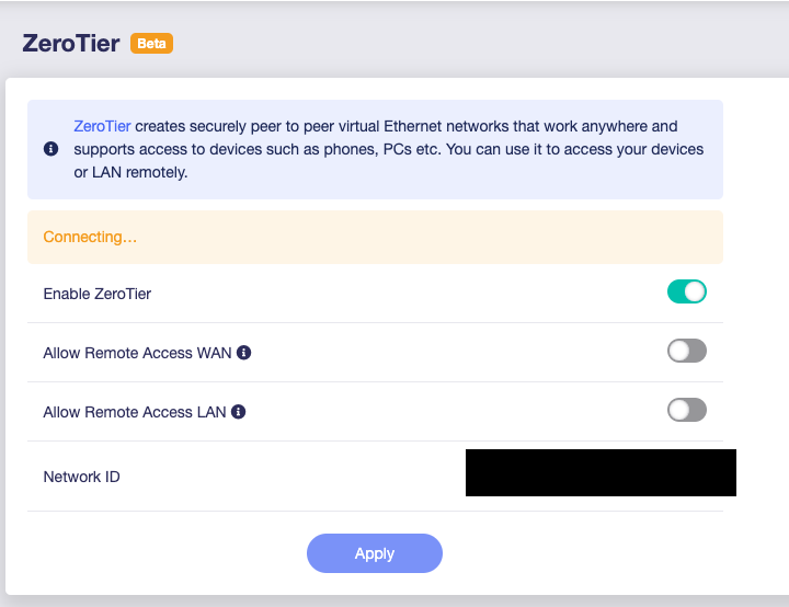 Every successful connection I’ve had to ZeroTier thus far has eventually updated as the instructional page says it would with something along the lines of “The device has been added to ZeroTier” and prompts me to add it. Every unsuccessful attempt just leaves me on the “Connecting…” prompt forever until I decide it’s been too long and to start over.