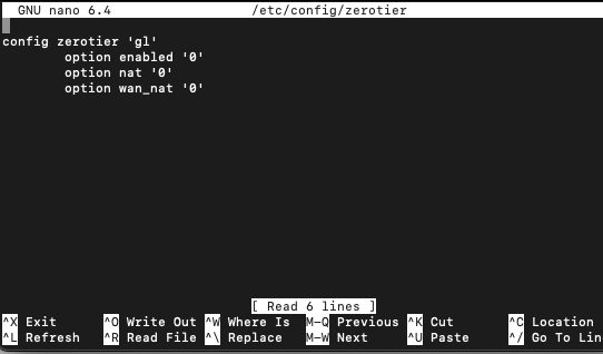 For reference - here’s what was seen when I ran nano /etc/config/zerotier: