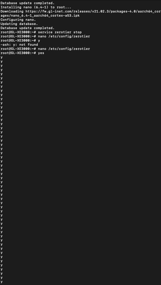 beautiful. I got almost everything done perfectly until the “input y” portion. Downloaded, ran the etc through nano command, it opened nano for editing - but my router/SSH already showed literally that exact configuration that was asked to change to. I pressed ctrl x, and then didn’t quite understand “input y” so I just typed ‘y’ as my command, and it said “-ash -y: not found” – seen in pic --, so I tried everything again thinking maybe ‘y’ stood for ‘yes’, and when I go the “input y” part, I typed ‘yes’, and now it won’t stop auto populating the letter ‘y’…?